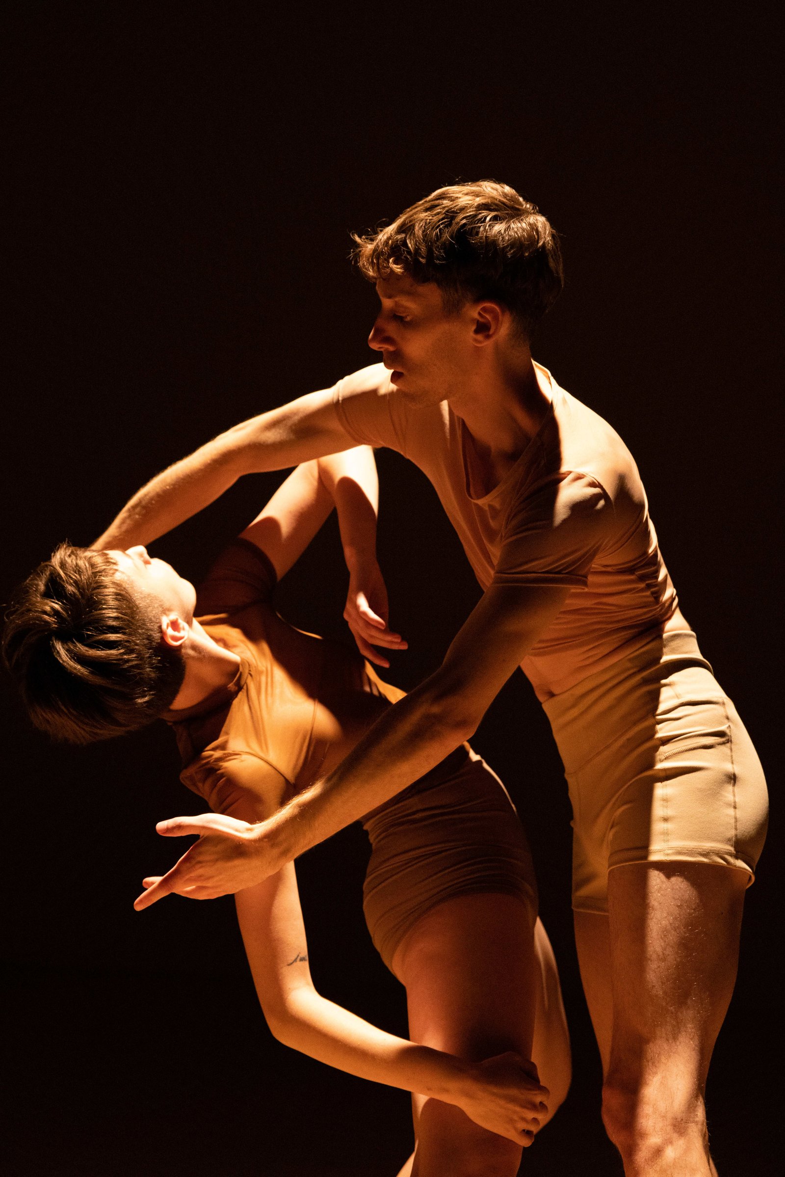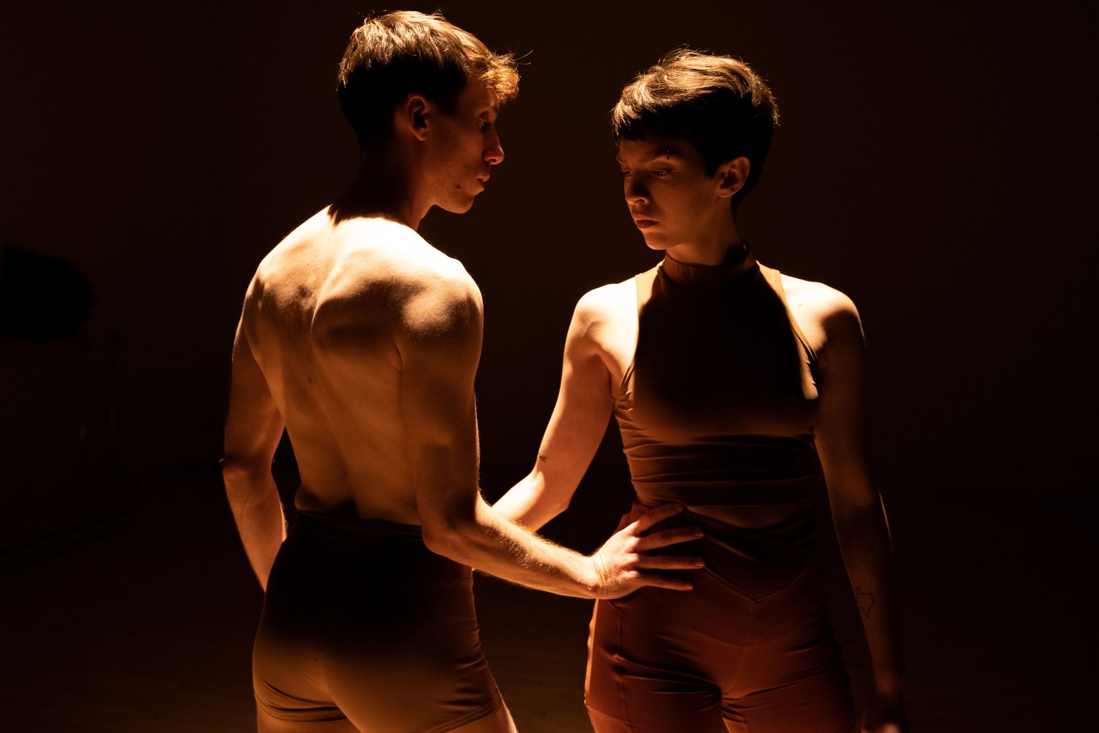 Developed during a Pillow Lab residency in 2023, the piece begins as an intimate duet that centers the relationship between human and digital systems. Wearable technology tracks pressure in the dancers’ hands and feet, transforming physical touch into live data that generates a shifting visual score. That data, in turn, shapes the music in real time, altering tone and mood as the numbers change. The dancers then react—to the music, to each other, and to the technology—creating a continuous loop of responsiveness that is both precise and deeply human.